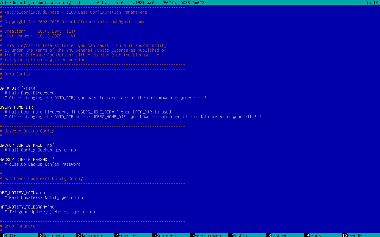 Damit hat man dwOS auf die Festplatte installiert und nach dem Neustart geht es mit dwsetup -> Base -> Edit Configuration weiter, hier kann man die Einstellungen (Tastatur, Hostname, IP Addresse usw...) vornehmen.